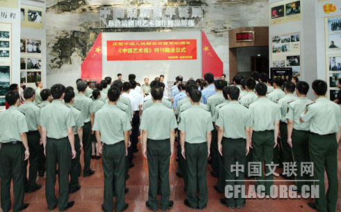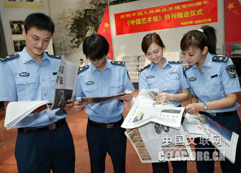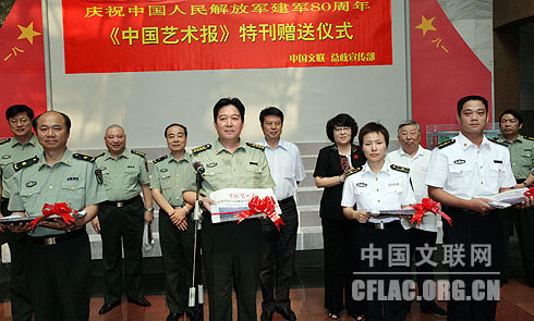 8月3日,《中国艺术报》庆祝中国人民解放军建军80周年特刊赠送仪式在北京八一剧场举行。中国文联党组副书记、副主席覃志刚,总政宣传部副部长、中国文联副主席张西南,《中国艺术报》总编辑李树声,总政话剧团团长孟冰,解放军艺术学院副院长朱向前,总政歌剧团团长黄定山,解放军军乐团副团长姜斯文,军队老艺术家阎肃,以及北京军区、海军、空军、二炮、武警部队和总政直属文艺单位的代表参加了赠报仪式。