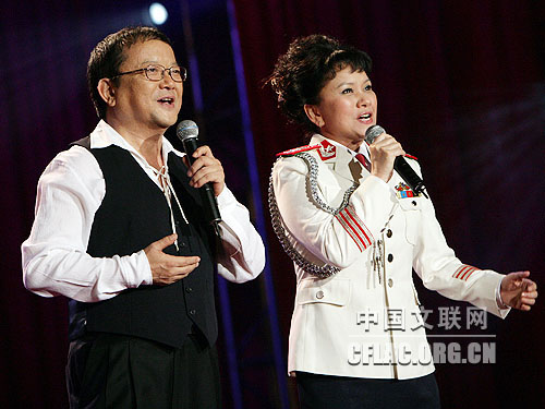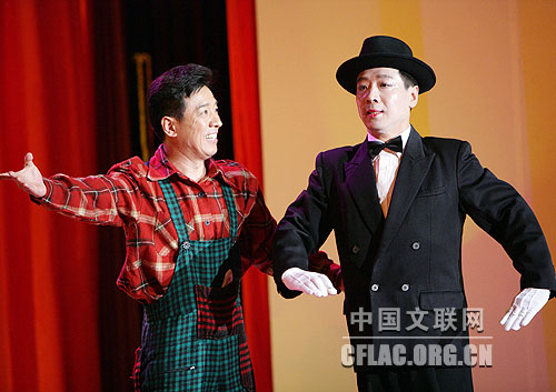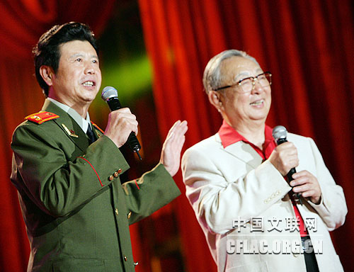 崔喜跃(左)和唐杰忠表演相声《连队歌声》