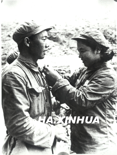 1953年在朝鲜战场为战士戴纪念章。