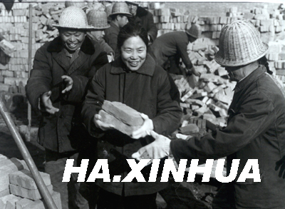 1977年在天津慰问演出时和河南建筑工人一起劳动。