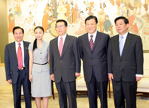 李长春(右三)、刘云山(右二)、胡振民(右一)与邢丹合影