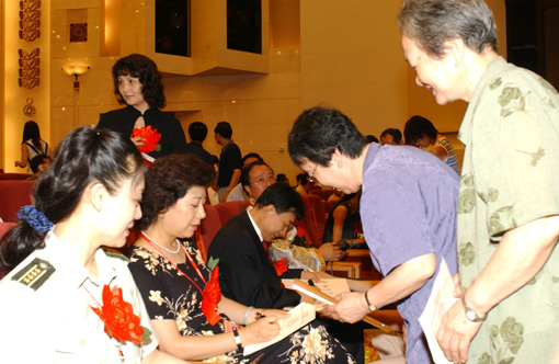 受表彰的艺术家为观众签名。