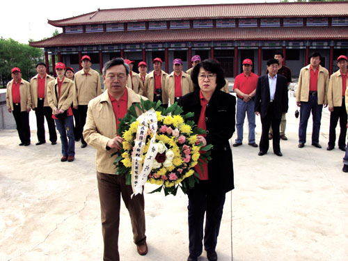 采访采风团团长顺强(左)、李树声向抗日烈士敬献花圈