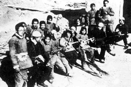 1944年,王莘(左一)在晋察冀边区带领群众剧社演员排练节目
