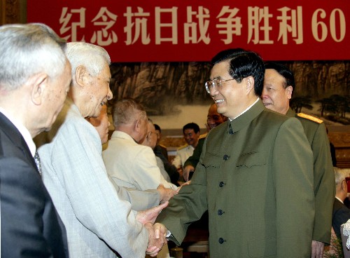 8月27日,中央军委在北京隆重举行纪念抗日战争胜利60周年驻京部队老战士座谈会。会议开始前,胡锦涛等军委领导亲切会见参加会议的抗日战争时期著名英雄模范和英雄部队代表、老民兵英模和驻京部队优秀基层干部代表。