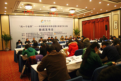 2月16日,由国务院新闻办公室、中国文联联合举办的“同一个世界——中国画家彩绘联合国大家庭艺术大展”活动在北京国际会议中心正式启动。中国文联党组副书记、副主席、书记处书记覃志刚,中国文联党组成员、副主席、书记处书记、中国美协副主席冯远,中国文联副主席、中国美协分党组书记、驻会副主席刘大为等出席新闻发布会。发布会由中国文联国内联络部主任夏潮主持。