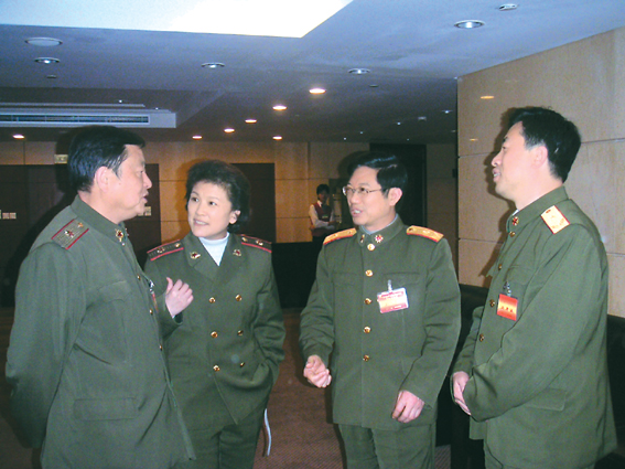 部队委员在畅谈。左为姚远、左二为宋春丽、右为明振江、右二为王兆海。
