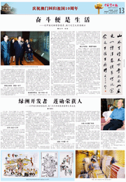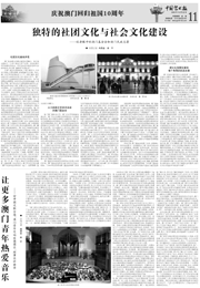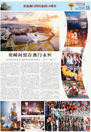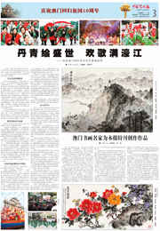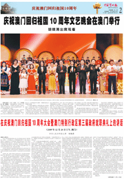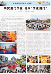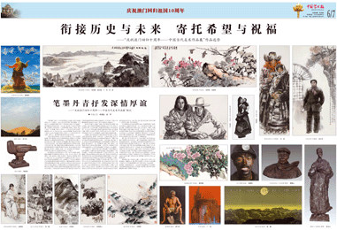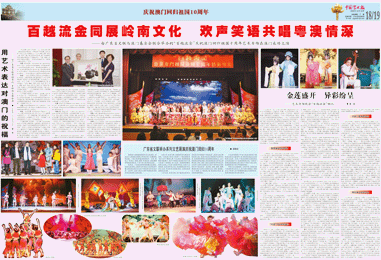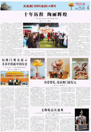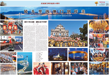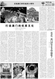 为全面呈现澳门文化艺术10年来的繁荣发展,本报和中国文联国际联络部精心组织实施了庆祝澳门回归10周年大型采访活动,先后派出3个采访组奔赴澳门,追踪报道庆祝回归10周年重大文艺活动,盘点回归10年来澳门文化建设成就,拜访澳门文化界名流和政府官员,寻访澳门文化景观和遗存。在本期特刊中,澳门历史悠久、特色独具的文化积淀,澳门文化人深切的爱国情怀,将得到集中展示。