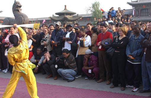 10月18日下午,各国艺术家在山西晋中榆次老城与当地群众联欢。