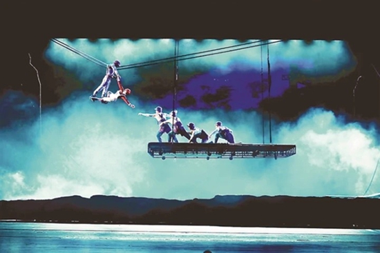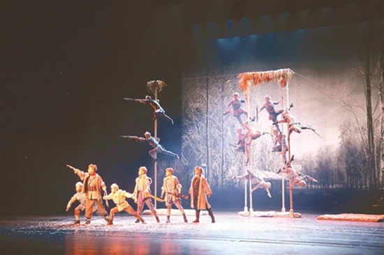 在技巧组合中,多个技巧之间的衔接、对比与呼应,形成了有意味的形式结构。这一结构本身即参与意义建构。例如,中国杂技团的《九级浪——杆技》中长杆与演员的交织互动,演绎了一场搏击海浪的场景,其中,技巧的选择、设计、组合均以“搏击海浪”这一戏剧动作为核心建构。