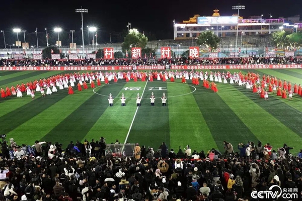 1月2日,贵州省黔东南苗族侗族自治州榕江县城北新区“村超”球场,演员在开幕式现场表演文艺节目(图源:央视网)