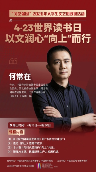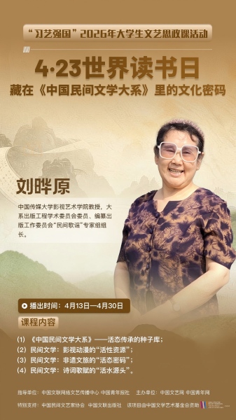 本次活动由中国文联网络文艺传播中心、中国青年报社共同指导,中国文艺网、中国青年网联合主办,面向全国高校大学生开放。此次上新的两门课程分别为《423世界读书日・以文润心“向上”而行》与《423世界读书日・藏在〈中国民间文学大系〉里的文化密码》,课程将通过中国文艺网哔哩哔哩(B站)官方账号持续播出至4月30日,为青年学子送上丰富的精神食粮。