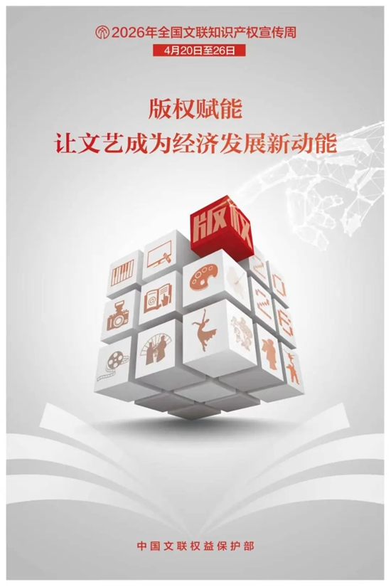 在第26个世界知识产权日来临之际,一年一度的“全国文联知识产权宣传周”活动将于4月20至26日举办。今年活动的主题是“版权赋能 让文艺成为经济发展新动能”,日前宣传周活动海报正式发布。在“全国文联知识产权宣传周”活动期间,中国文联权益保护部将与四川省文联在成都共同举办“全国文联知识产权宣传周”启动仪式。各全国文艺家协会及各省(区、市)文联将同期开展系列宣传活动。