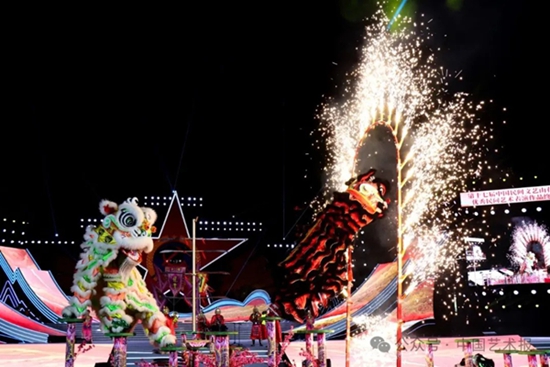 【作品介绍】广东遂溪醒狮起源于明末清初,是融合舞蹈、武术、杂技、音乐于一体的民俗表演。《岭南雄狮飞跃刀山过火海》融入了“上刀山”“过火海”等民俗表演形态,注重视觉效果的呈现——舞台上,“刘备狮”“关羽狮”“张飞狮”仿佛穿越时空,回到了桃园,他们精彩演绎了“桃园三结义”的故事,呈现了“拜礼”“上山”“登高”“寻青”“采青”“飞跃刀山”“过火海”“下山”等套路,演绎了上桩、桩上飞跃、桩上连环回快走、蜻蜓点水、金鸡独立、钳腰回望、壁虎功、悬挂等高难度动作。节目让人充分感受到了“醒狮醒国魂,击鼓振精神”的独特气质。