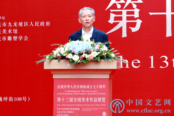 9月25日,“第十三届全国美术作品展览雕塑作品展”在重庆开幕。图为中共重庆市委宣传部副部长张洪斌致辞。中国文艺网 韩雪竹摄