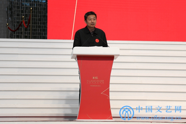 10月10日,“第十三届全国美展实验艺术作品展”在廊坊开幕。图为廊坊市委副书记、副市长胡晓军在开幕式上致辞。 中国文艺网 高森 摄