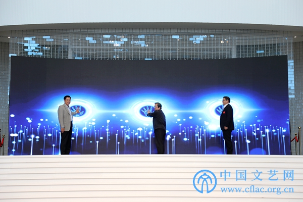 10月10日,“第十三届全国美展实验艺术作品展”在廊坊开幕。图为中国文联副主席、中国美协名誉主席冯远,中国文联副主席董伟,中国美协分党组书记、驻会副主席徐里共同为展览启幕。中国文艺网 高森 摄