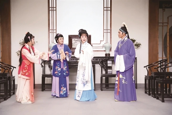 从舞台到银幕,《双蝶扇》的拍摄始终把保留闽剧“儒林风”作为重要使命,从多个维度进行精心雕琢,力求原汁原味地呈现闽剧的独特韵味。片中,演员们的服饰典雅、妆容考究、身段优美、唱腔婉转,老戏迷能找到熟悉的“那个味儿”;而电影的优势也发挥得淋漓尽致,有意味的景别切换、有叙事的镜头运动、有情感的剪辑节奏,更加灵活地展现了故事和人物情感。尤其是在表现男女主角之间的情感纠葛时,导演运用近景镜头细腻地捕捉演员的面部表情和眼神变化,让观众能够走进角色的情感世界,从而产生强烈的情感共鸣。和舞台作品相比,声音设计无疑是戏曲电影可拓展的新天地。该片精心设计的环境音效与戏曲唱腔形成虚实相生的听觉体验,使得观众更能沉浸于影片所营造的情境中。可以说,戏曲电影《双蝶扇》完成的不仅是传播媒介的转换,更通过融合创新的艺术语言赋予戏曲新的生命力。