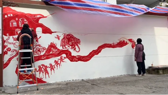 这场艺术接力的背后,是两代人对非遗剪纸的共同热爱,更彰显了新大众文艺澎湃着“全民共创”的力量。“我一直想让剪纸走出红纸之间,让更多人看到剪纸的美。”刘芸说。因女儿学习油画,刘芸曾对着墙壁反复思索呈现方式,后来与女儿一拍即合——以油画与剪纸结合的形式,将垣曲的山水人文、历史传说绘于墙面,让这份独特的美被更多人看见。