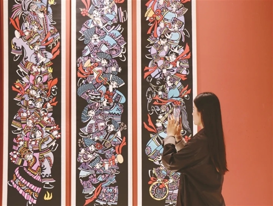 图为观众在第三届全国优秀青年民间工艺美术家作品展中参观剪纸作品《团结颂》。