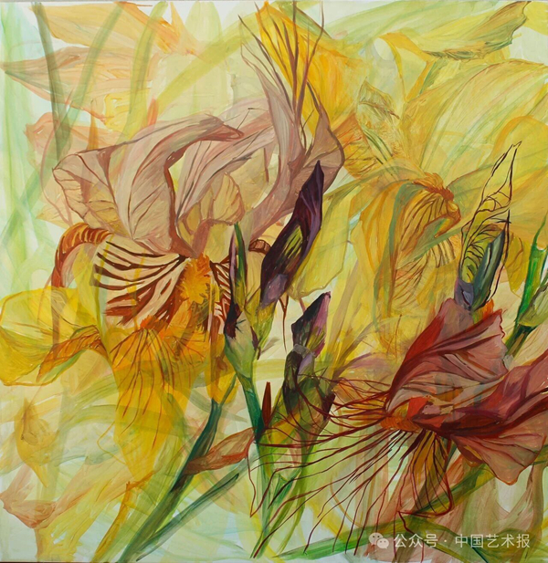 “共生”里也饱含着人与人之间的携手合作。雕塑《速写日记——雕塑工厂》以金属焊接的形式,结合写意雕塑的语言和中国画线条笔墨的风格,勾勒出一幅艺术家与工人配合创作的立体画面。“共生”里还有对构建人类命运共同体的追求。中国画《多彩世界》用传统水墨设色的形式,以兼工带写描绘世界各国人民向着美好愿望欢快奔赴的景象。布面丙烯《穿越时间的和平》以表现主义风格,借象征和平的橄榄叶,寓意成长与发展;缠绕的叶片象征成长与延续,恰似其间相拥的手,体现不同肤色、族裔的男女老少间的凝聚力,诠释和平共处的多样表达——我们同为人类,共享充满祝福和富庶的美好世界。