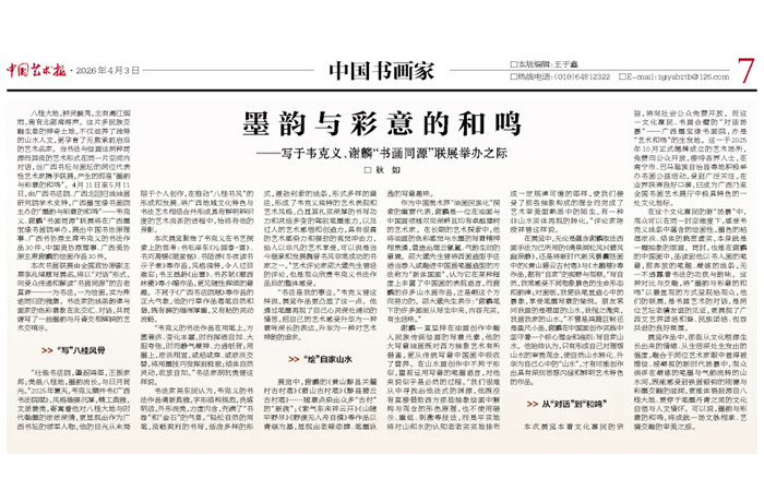 4月11日至5月11日,由广西书法院、广西北回归线油画研究院学术支持,广西墨宝缘书画院主办的“墨韵与彩意的和鸣”——韦克义、谢麟“书画同源”联展将在广西墨宝缘书画院举办。