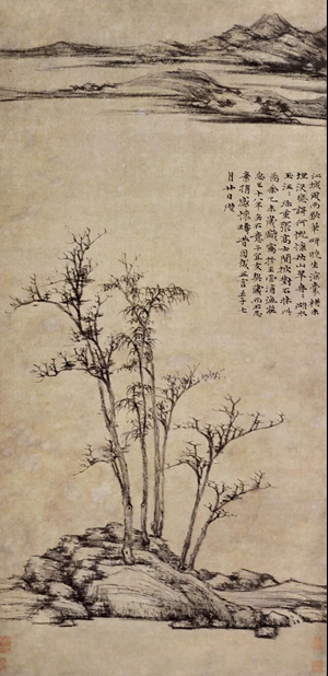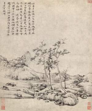 故宫博物院藏其《林亭远岫图》,题作于癸丑(一三六三)夏五月初十。虽是盛夏,画中却是枯槎当立,学李成法,以湿笔画出的碎枝,更见冷寒之状。远目遥岑,也是气象萧森。颇有他评李成画所言“林木苍古,山石浑然,径岸萦回,自然趣多”的意味。
