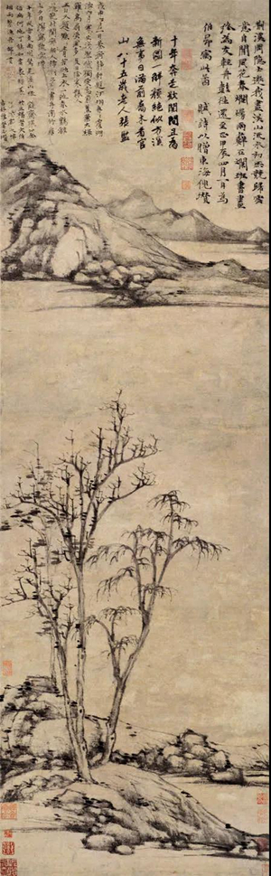 藏于上海博物馆的《渔庄秋霁图》,董其昌认为,为云林极品,[21]安岐认为,此画为云林“绝调”[22]。图作于一三五五年,一三七二年云林重题此图。画面中央近景处,焦墨画平峦上枯树五株(所谓孤桐只合在高岗),向空天中伸展,体势昂扬。中段空景,以示水体。向前乃是沙岸浦溆,以横皴画远山两重,约略黄昏之景。这当与他在太湖边生活的视觉经验有关,站在近岸,朝暮看太湖远山,就有这样的感觉。而这又非视觉经验的直接呈现。“悲歌何慨慷”(云林题此画语)—江城暮色中,风雨初歇,秋意已凉,正所谓袅袅兮秋风、洞庭波兮木叶下,云林于此画一种悲切,一种高旷,一种乾坤了望眼、幽意自彷徨的精神。意度主宰着画面空间的选择,不是由江岸视觉源点的远望所及,只是突出树、石等符号,略去种种(包括小舟、行人、暮色中的鸟),虚化种种(陂陀中的沙水,也非目击下存在之样态)。一切皆出于意度衡量之需要,需要在苍天中昂藏得法的高树,需要一痕山影的空茫,就尽意为之,而题诗中所说的“翠冉冉”“玉汪汪”等,一无踪迹。[23]画与王云浦的渔庄实景并无多大关系,系一种精神书写。