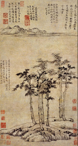 云林毕生喜画竹,传统竹画追求“此竹数尺耳,而有寻丈之势”,他却对“势”—运动感的追求并不热衷,却更愿意通过竹画来表达随处充满、无稍欠缺的精神。他喜画一枝竹,其《竹梢图》,没有繁复的形式,只是略其意趣。他自跋云:“此身已悟幻泡影,净性元如日月灯。”竹影飘忽,虚灵不昧,是他属意的世界。藏于“台北故宫博物院”的《春雨新篁图》,画一枝竹,上有多人题跋,其中叶著跋云:“先生清气逼人寒,爱写森森玉万竿,湖海归来已蝉蜕,一枝留得后人看。”云林一枝竹带给人独特的审美享受和思考。