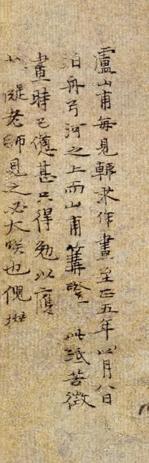 [21]董其昌说:“此《渔庄秋霁图》,尤其晚年之合作者也。”(据李佐贤《书画鉴影》卷二十著录)董其昌误此图为云林晚岁之作,其实此图作于一三五五年,未题,十七年后题此图。