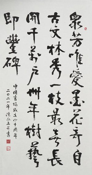 习近平总书记指出,坚持守正创新,用跟上时代的精品力作开拓文艺新境界。要把艺术创造力和中华文化价值融合起来,把中华美学精神和当代审美追求结合起来,激活中华文化生命力。这为当代书法人的为人、做事、从艺提供了行动指南。