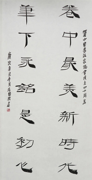 新的一年,中国书协将紧紧依靠广大书法工作者,不忘初心、牢记使命,扎根中华民族优秀传统文化沃壤,紧紧把握时代脉搏,努力在培根铸魂上展现新担当,在守正创新上实现新作为,在明德修身上焕发新风貌,深入生活,贴近时代,贴近人民,创作思想精深、艺术精湛的精品力作,让书法艺术的百花园,以崭新的姿态向人民绽放,共同迎接新时代姹紫嫣红文艺春天的到来。