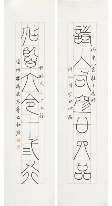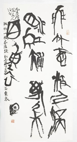 写铁线篆,须气静,蓄势蓄力,有耐心,有韧劲,方能笔笔圆润、笔力遒劲。杨涛君的铁线篆脱胎于李斯《峄山碑》、李阳冰《三坟记》、唐人《碧落碑》等经典碑刻;大篆则根植于三代吉金文。因此,他笔下铁线篆的刚健婀娜与大篆的厚重恣肆,以及隶书行笔的波磔熔为一炉。线质扎实、劲健、苍深,用笔峰峦起伏、迟涩飞动。不仅如此,他的草书以唐人狂草为本,兼及宋人草书韵致,取法高古,自有逸气。