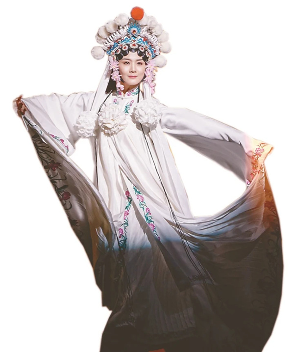 关于舞剧的“二幕”,场刊的表述是:“20世纪70年代中。老戏解放,天时地利人和,忆秦娥成角。忆秦娥初恋封潇潇,但是却爱而不得。”在笔者看来,“二幕”只是一个导向“三幕”的“过场戏”;从舞剧叙事的“戏剧性”而言,对二、三两幕可以合而论之。场刊对“三幕”的表述是:“20世纪80年代。改革开放,商品经济,秦腔为其搭台唱戏。成角儿的忆秦娥亮眼,刘红兵慕其财色而穷追,终以舆论而挟持成婚,但是其婚姻却解体。西方文化的冲击,秦腔势衰,忆秦娥茶馆演唱,再成‘搭红’的对象。”“二幕”幕启,乐音中“秦腔”吼起来。台中后区有一条板凳,坐凳者以双手虚拟击板鼓状,凳后6人配合默契,宛如小型的伴奏乐队开启了正剧的前奏。切光后空间转向舞台,一台大剧正奔向“高潮”——8位武生“靠旗”凛然,红紫衣装神采奕奕;8位正旦“垂辫”轻漾,蓝绿衣着逸态悠悠……对于将要登台的忆秦娥而言,这部大剧的“高潮”又仿佛一个“前奏”。舞台暗转,天幕影像跳闪切换,忆秦娥在脸谱勾描、服饰披戴中静候出场,而天幕下的舞台后区也排列着貌似“拣场”的束装男子……忆秦娥一袭白裙绰约闲靡,机迅体轻,蜲蛇姌嫋,云转飘忽——以“白娘子”的扮相诠释着“主角”的意涵。此时,天棚降下若干巨大的“戏服”,貌似“拣场”的束装男子如操持“杖头木偶”般让“戏服”的长袖飘拂,让“老戏解放”如“彩练飞舞”。灯光渐渐压暗,“淡淡妆,天然样”的忆秦娥和封潇潇仿佛从戏里走到戏外——无论是大圈追逐还是小圈凝注,两人却始终未能“牵手”,一如剧中的白娘子和许仙……音乐中裹挟着嘈杂的叫卖声,当“物资交流大会”的横幅在后区的小戏台上高挂之际,舞剧进入了“三幕”。各种摊贩在前区过场后,十余人挟着条凳来参加“物资交流”了。这段本为“铺底”的群舞,由于占据显要位置并放纵蓄积情绪而成为舞剧表现的“大潮”,身着红色戏装仍在饰演杨排风的忆秦娥被淹没在“大潮”的声浪中。一段老陕“rap”伴着十余人的“条凳舞”拔地而起:“一二一,花生米;吆二吆,鸡蛋糕……陕西愣娃一亮相,穷山恶水都得让;陕西愣娃一亮相,天大的困难都敢上……美不美家乡水,亲不亲来故乡人……陕西愣娃一亮相,罡板硬正响当当;陕西愣娃一亮相,一根筋来比牛犟……爱家乡来爱乡党,见了乡党泪汪汪……”领头的忽又喊起:“来段秦腔‘祖籍陕西韩城县’好不好?”随声附和后便吼起了秦腔:“祖籍陕西韩城县,杏花村中有家园。姐弟姻缘生了变,堂上滴血蒙屈冤。姐入牢笼她又逃窜,不知她逃难到哪间。为寻亲哪顾得路途遥远,登山涉水到蒲关……”在笔者看来,这段老陕“rap”和一段秦腔“生变”应该用字幕配合。因为这段经济“大潮”瓦解了忆秦娥的演艺“高潮”,显见的是其人生的又一“拐点”,“拐点”中出现了极其“物质”的刘红兵。或许他毕竟是忆秦娥的第一任丈夫,他围着忆秦娥“团团转”的哑剧性表演尽管极其“粗糙”,但占了很大篇幅。在观众的印象中,物质性的空间摆设和行动介质充斥着舞台。在时代经济大潮的裹挟、亦在刘红兵膨胀物欲的“绑架”中,倔强的忆秦娥此时爆发了她的全部“倔强”……尽管天棚降下一幅矩形框架,坐在条凳上的忆秦娥与刘红兵留下了一张“结婚照”,但随着框架的移去,忆秦娥“移步换形”而步入了茶馆……在茶客围坐的数张方桌之间,忆秦娥再次寻觅到自己的舞台——舞台中线两侧各有一排系着红绸的靠背椅,在戏腔韵白伴奏下正经历着“主角”向“搭红”的转型,而椅背上的“红绸”应该是导演不乏刻意的隐喻!