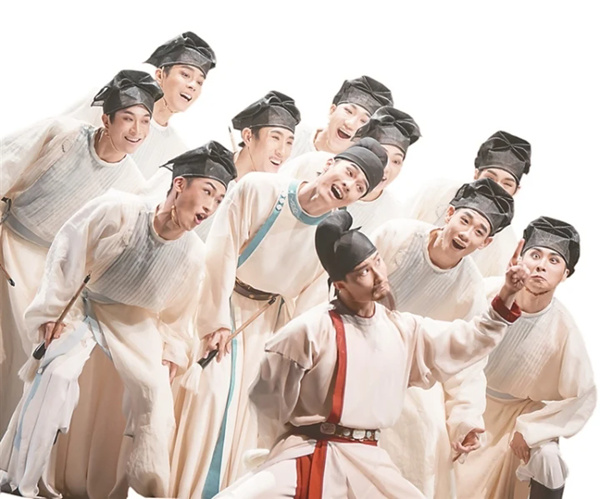 颜真卿从上场门一侧步入眼前的现实中,在有声无语的哼鸣中,在如雾如烟的熹微中展开了表达自己心志与血性的舞蹈……在心志与血性的表达中,颜真卿最铭心刻骨的便是侄儿季明——舞台后区出现了手持习书之笔的侄儿季明,宛如浊世的一股清流来到身旁;颜真卿在与之共舞间接过侄儿手中之笔,而这其实是他在取笔之际思之愈深的心象外化。悲情愤书而致的枯笔、破锋间,巨幅的《祭侄文稿》自天棚而降——这篇由情感驱动的笔墨,节奏随情绪起伏,因极度悲愤而进入书法的“忘我”之境,无意而为却以厚拙、灵动的线条开创了雄强豪迈的盛唐气象……颜真卿捧起案几上的侄儿首榇,向舞台深处、也是向历史深处踱步而去。一众肩背插翎、双手持翎的舞者,将雉翎如“靠旗”般舞动,俨然《祭侄文稿》的悲愤之气、雄秀之风溢出书帖而浸漫乾坤,乐音中的哼鸣之声也由此愈发高亢,向着云天九霄喷薄升腾!哼鸣之声转向如泣如诉的二胡弦音,在弦音与乐队的和鸣中,一名舞者背负硕大的石碑从颜真卿远去处而出,更多背负硕大石碑的舞者由上场门一侧向下场门方向迤逦而行;安顿好侄儿首榇的颜真卿携一众“靠旗”般舞动雉翎的舞者,融入弧形相衬的石碑林立之间,在负碑舞者坚毅、沉郁的逆时针旋动中,实现着血性与墨迹、人格与书风的熔铸统合。舞台光区渐渐压暗,依稀可见的是颜真卿伟岸的背影——背投光中出现愈来愈多受追思、追随颜真卿的来者,诵读着《颜氏家训》的训言:“行诚孝而见贼,履仁义而得罪;丧身以全家,泯躯而济国。君子不咎也!”来者不断诵读、不断前行,由此而以“君子不咎也”推向高潮。笔者此时真是感慨主创们的洞见:他们由颜真卿《祭侄文稿》开篇,追溯到其祖先北齐文学家颜之推的《颜氏家训》,通过这一“颜氏文化”并峙高耸的双峰,申说中华优秀传统文化中“家国一体”的观念。尾声《墨尽》的字幕此时显现:“青灯燃尽,墨痕未干,颜氏家训振聋发聩。待东方既白,再赴征程,这一程定不负颜氏,不负家国,不负苍生!”仍然是贯通全剧的哼鸣声起,《祭侄文稿》由投影覆盖整个天幕,从“学堂授业”到“祭侄传道”,从克制隐忍到悲歌慷慨,舞剧将颜氏一族的家国情怀呈现得淋漓尽致,更将颜真卿忠正耿直的血性墨迹传达得无以复加。舞台纱幕犹如悠远的历史深处,一身血色袍服的颜真卿缓缓回身,在《祭侄文稿》的映衬下以身为模、以字为范,让无数后来者体验着“一笔一脊梁,一字一山河”,体验那份穿越千年的深沉激荡!