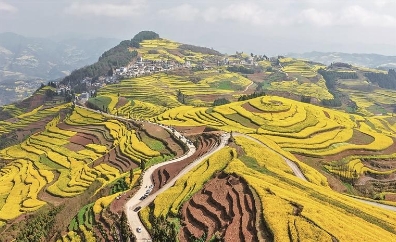 早春时节,云南省罗平县漫山遍野的油菜花迎来盛花期,构成了一幅美丽的春日画卷,吸引四方游客前来赏景游玩。图为2月22日拍摄的罗平县马街镇鸭格塘云上花梯油菜花景色。