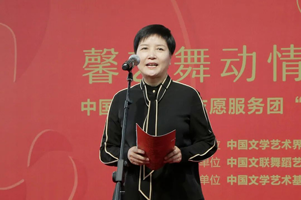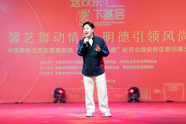3月15日,“馨艺舞动情怀 明德引领风尚”中国舞协文艺志愿服务团“送欢乐·下基层“赴雄安新区慰问演出举行。图为中国舞协分党组成员、秘书长夏小虎致辞。