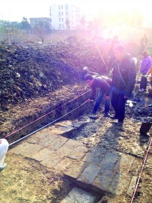 随后,工作人员在2号探沟中发现一处“L”形的铺砖,这令张铁军大感意外。记者看到,此处铺砖为平板电脑大小的青砖铺成,有平地也有斜坡。