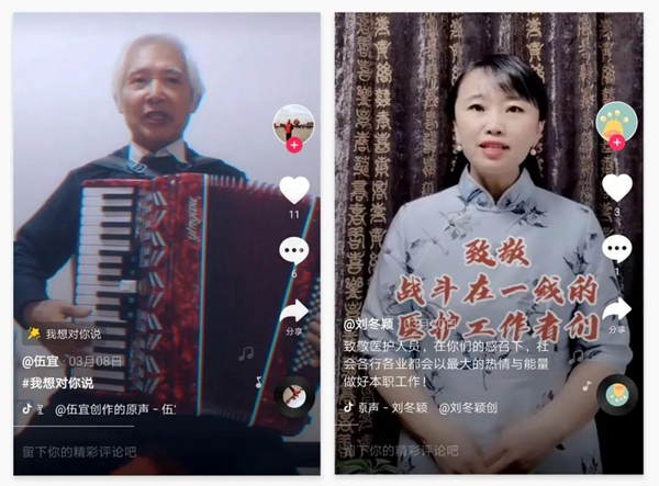 与其他艺术门类表演型艺术家不同的是,许多文艺评论家仍然习惯于传统的传播媒体,还不大适应抖音、快手这类新兴短视频传播平台。尽管协会在确定邀请对象时,有意向相对年轻的评论家调整,但32位受邀评论家中,仅有12位评论家在此前开设有抖音账户,另外20位评论家在这次活动中才首次试水抖音、快手短视频平台的运用。一场疫情肆虐的危机转变为善用网络新媒体传播平台的契机。通常文艺评论都是以长篇幅的文字形式传播,随着互联网时代的到来,公众获得信息的渠道在改变,微视频、微评论受到特定人群的欢迎,短视频新媒体平台在文艺评论传播生态中开始占有一席之地。尽管是首次使用,没有足够多的粉丝捧场,但受邀的艺术家都毫无怨言、兴致不减,纷纷在受邀之后主动学习操作使用。有评论家笑称参加这次活动才发布了自己的“处女抖”作品。一些评论家坦言原本认为抖音都是年轻人玩的,但经过亲身录制之后发现,其实短视频不仅形式新颖,同时也可以内涵丰富。年过古稀的评协会员、一级作曲魏德泮先生,不仅夸赞活动好,而且主动向自己的外孙女学习如何使用抖音。一头银发的魏老师在视频中边弹手风琴边演唱《英雄赞歌》,以此表达对抗疫英雄的讴歌赞美之情,令人为之动容。黑龙江大学文学院副院长、二级教授刘冬颖在视频中引用《诗经》“岂曰无衣?与子同袍”的诗句,精心搭配传统旗袍服饰和篆书图案、古色古香的窗帘背景,营造典雅氛围。她反复尝试,一连换了七八套旗袍,只为求得最佳传播效果。