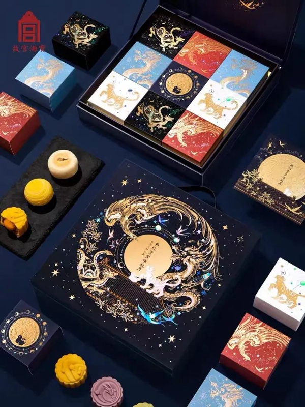 故宫的月饼礼盒创意来源于乾隆帝御制诗句“共欣穹宇中秋月”,将天上的星宿绘作四方灵兽,即青龙、白虎、朱雀、玄武,在浩瀚星空中,与君共赏这一轮中秋圆月。