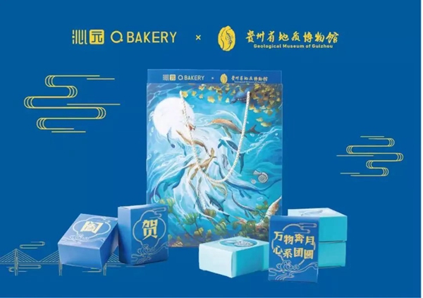 贵州省地质博物馆推出的文创月饼礼盒封面将贵地博古生物与中秋进行完美结合,“海百合”寓意欢聚一堂,“鹦鹉螺”映出皎洁月色,“邓氏贵州鱼龙”伴你遨游故乡 ,“多板砾甲龟龙”带来月下圆满。