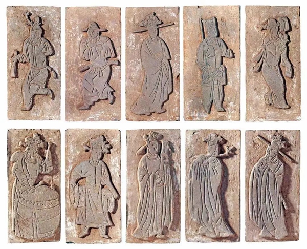 第一排五件为杂剧人物雕砖,第二排五件为散乐人物雕砖 图片来源:河南省博物院