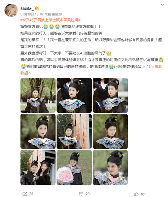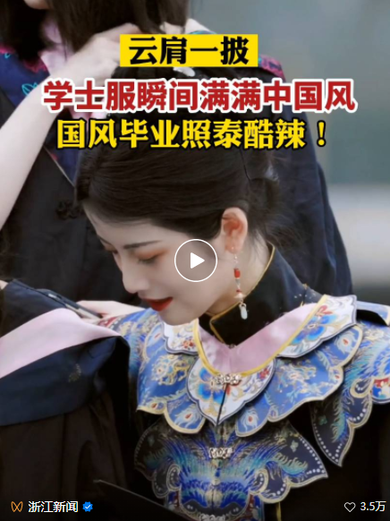 她身穿汉服风格的学士服,