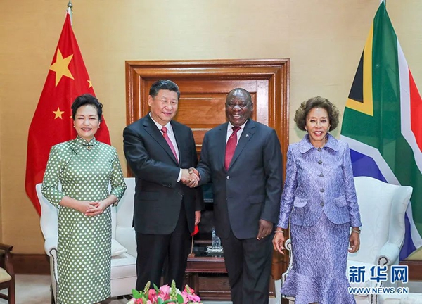 2018年7月24日,国家主席习近平在比勒陀利亚同南非总统拉马福萨举行会谈。这是会谈前,习近平和夫人彭丽媛同拉马福萨和夫人莫采佩合影。新华社记者 谢环驰 摄