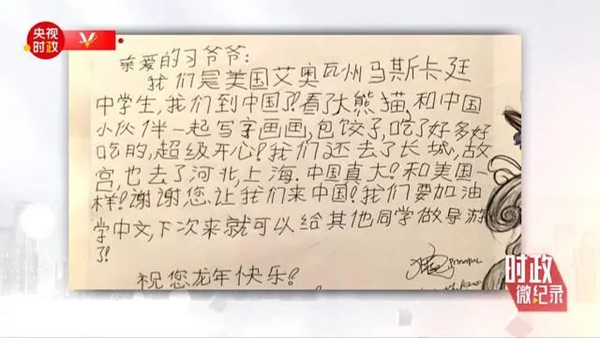 在给美国马斯卡廷中学访华代表团学生的回信中,习近平表示,你们来信的汉字写得很漂亮,手绘的中国龙、长城和熊猫很形象!得知你们到访了好几个城市,看大熊猫,品中国美食,体验中华文化,感到“超级开心”,我非常高兴。听说你们结识了许多中国小伙伴,并且邀请他们回访你们的家乡,你们之间结下的友谊令人感动。