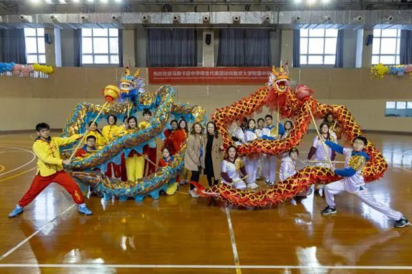 1月29日,在复旦大学附属中学,美国马斯卡廷中学学生参加舞龙体验活动。新华社记者 王翔 摄
