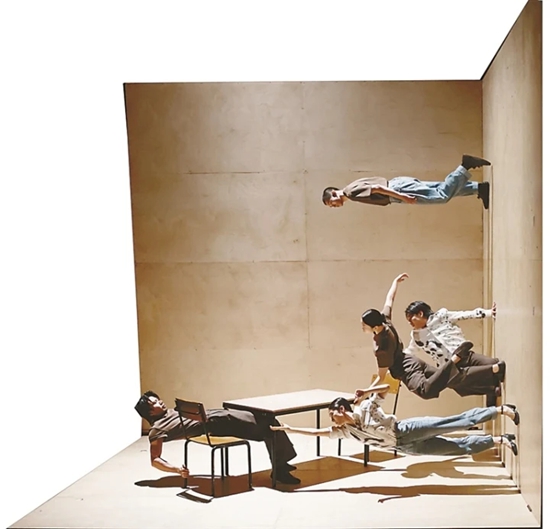 最让人产生身体陌异感的恐怕是第一部作品,这是由法国编导尤安尼·布尔热瓦和玛丽·布尔热瓦与荷兰舞蹈剧院一团于2020年合作首演的《梦不见了,但我记得》。这部作品相当挑战观众的观看习惯以及舞者的身体动作习惯,编导的想象力和作品本身的意味也足以让观众惊叹和品味。舞台中央矗立着一个由三块面板围成的窄小空间,里面摆放着一桌两椅,从演员踏入这个看似寻常的空间的那一刻起,“魔法”就开始了。活动面板逐渐将观众的水平视线解构,代之以斜面、竖直面以及天花板等不同“水平面”的多个视角,其间还不时地在面板上嵌套影像空间。一桌两椅与空间的重力关系被不断调转,清晰地指示着空间的变换,最初的一对男女在这多重空间里幻化为好几对。因为重力改变,他们之间的关系发生了若干位移、变化和新的连接。仅从身体层面上看,演员始终在克服重力。他们不仅需要在斜面、垂直面、倒挂的天花板上如同玩杂技一般去呈现难以想象的身体动作,而且还要在这些非常规水平面上游刃有余地移动。暂且不问编导为什么要突出这样的“反重力身体”,将这种“反重力身体”作为作品本身的形式语言就是对我们既有的所谓舞蹈“身体观”的挑战。观众或许会新奇地意识到这种身体及其运动也可以是舞蹈,而当舞者说“我觉得心都要跳出来了,腿也开始不听话了”,或者说“人来到很高的地方就自然感觉到危险,心里会紧张”时,中国舞者的“舞蹈身体”概念或许也有更新:他们需要重新面对内心的紧张和恐惧,并用自己的经验和反复练习去完成反重力情况下身体的运动和连接。