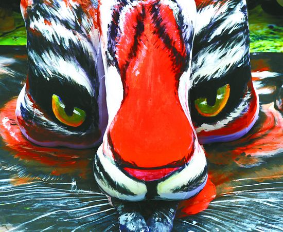 当日,在福建福州三坊七巷光禄吟台,一名画师以三名身着白衣女子的后背和地面为“画纸”,借用人体彩绘艺术画出一幅3D老虎画,吸引不少游客参观。新华社发 郑帅 摄