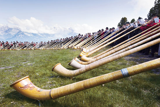 7月22日,在瑞士西南部的宁达斯举行的第11届国际长号节上,演奏者吹奏长号。