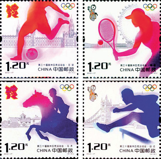 第三十届奥林匹克运动会于伦敦当地时间7月27日晚开幕。中国邮政特发行《第三十届奥林匹克运动会》纪念邮票1套4枚,名称分别为足球、网球、马术、田径。